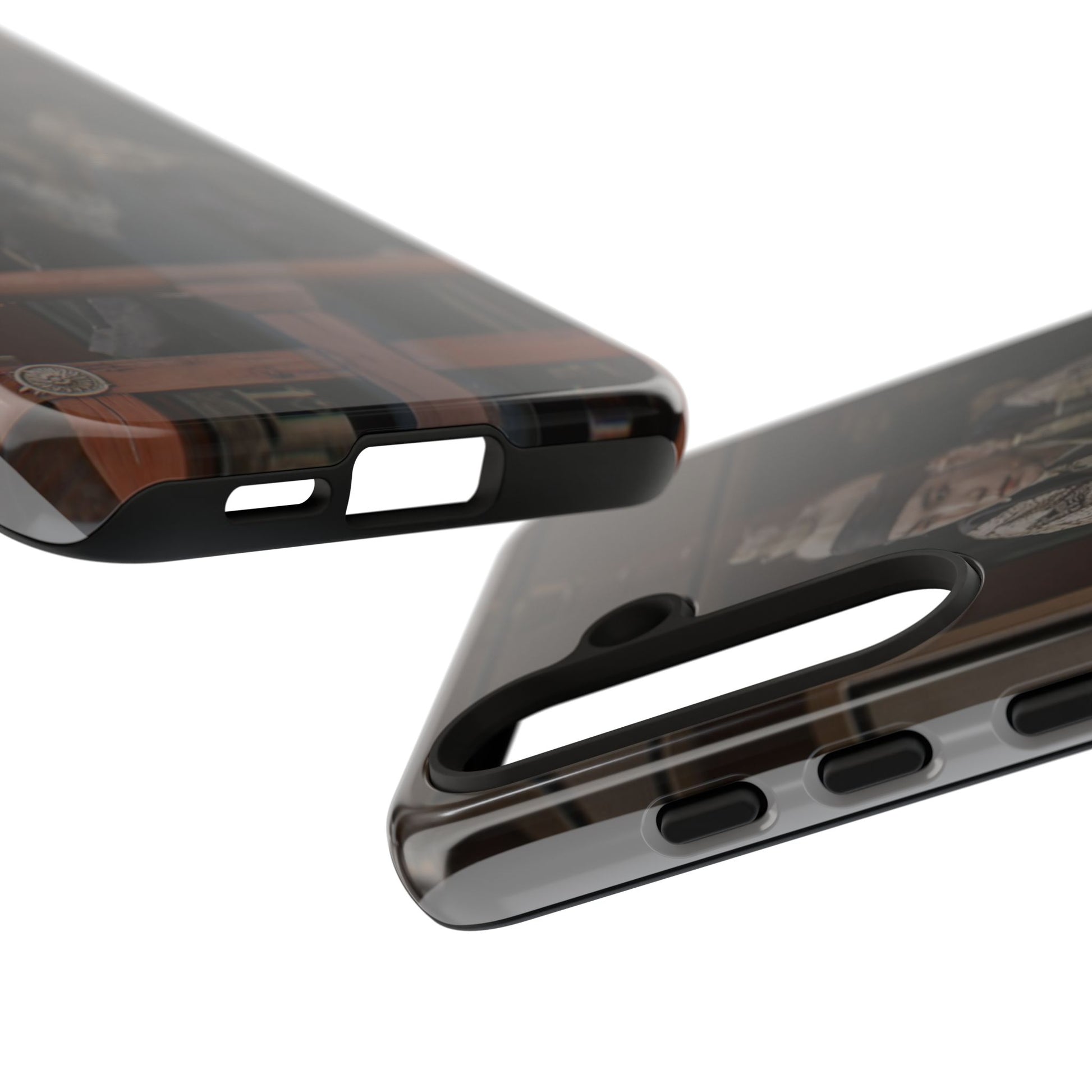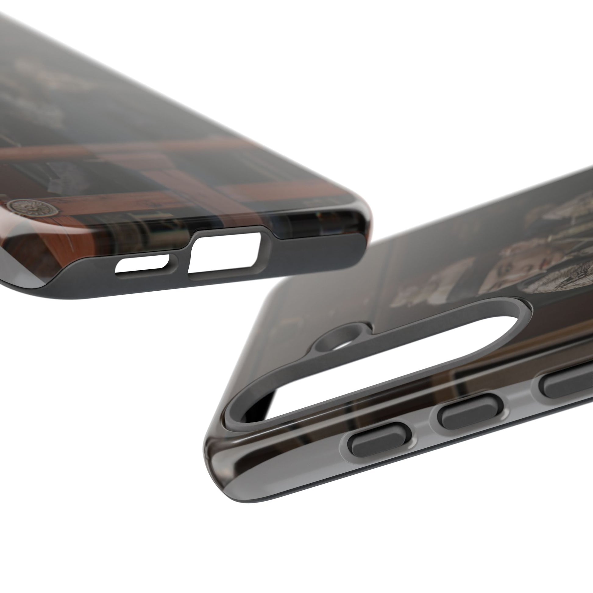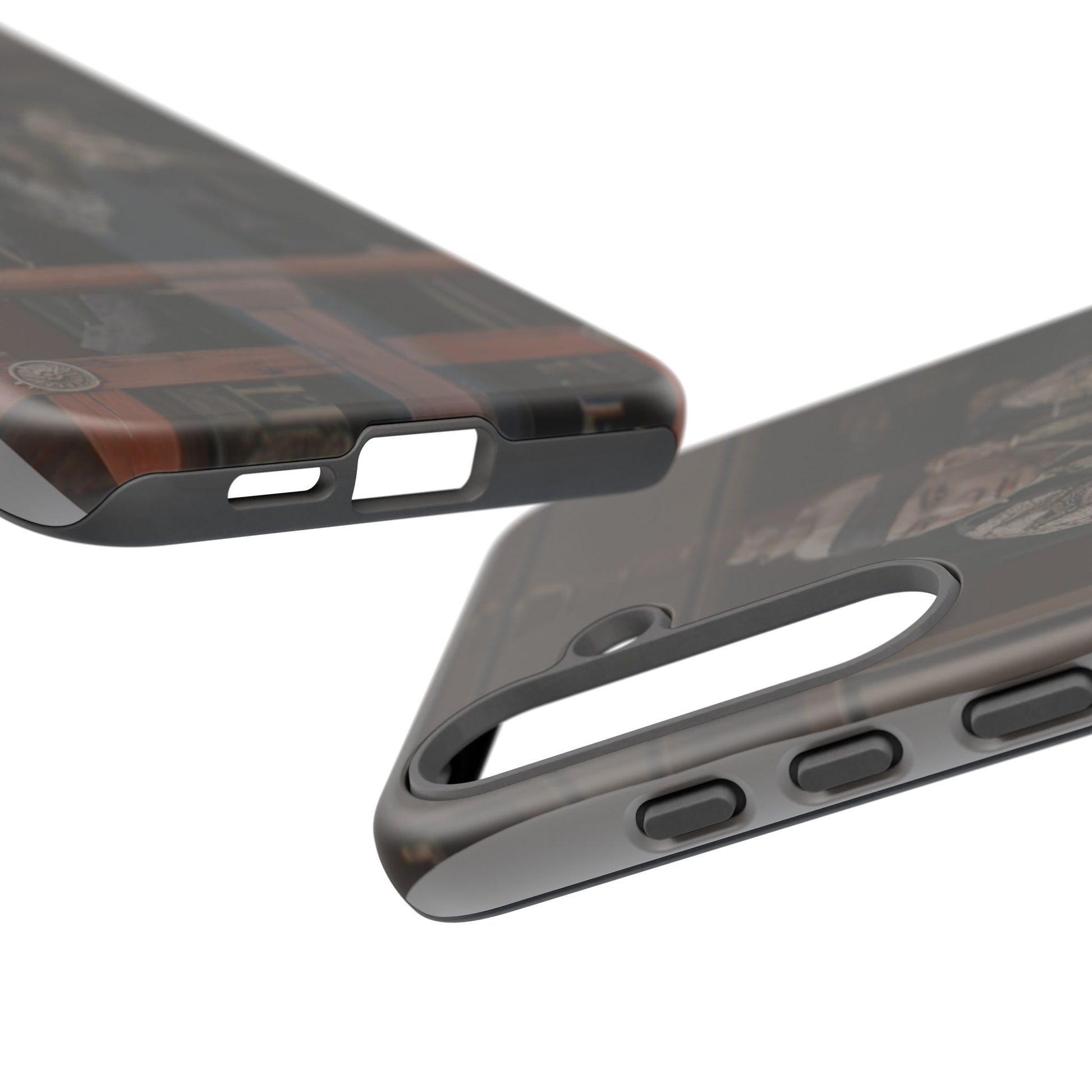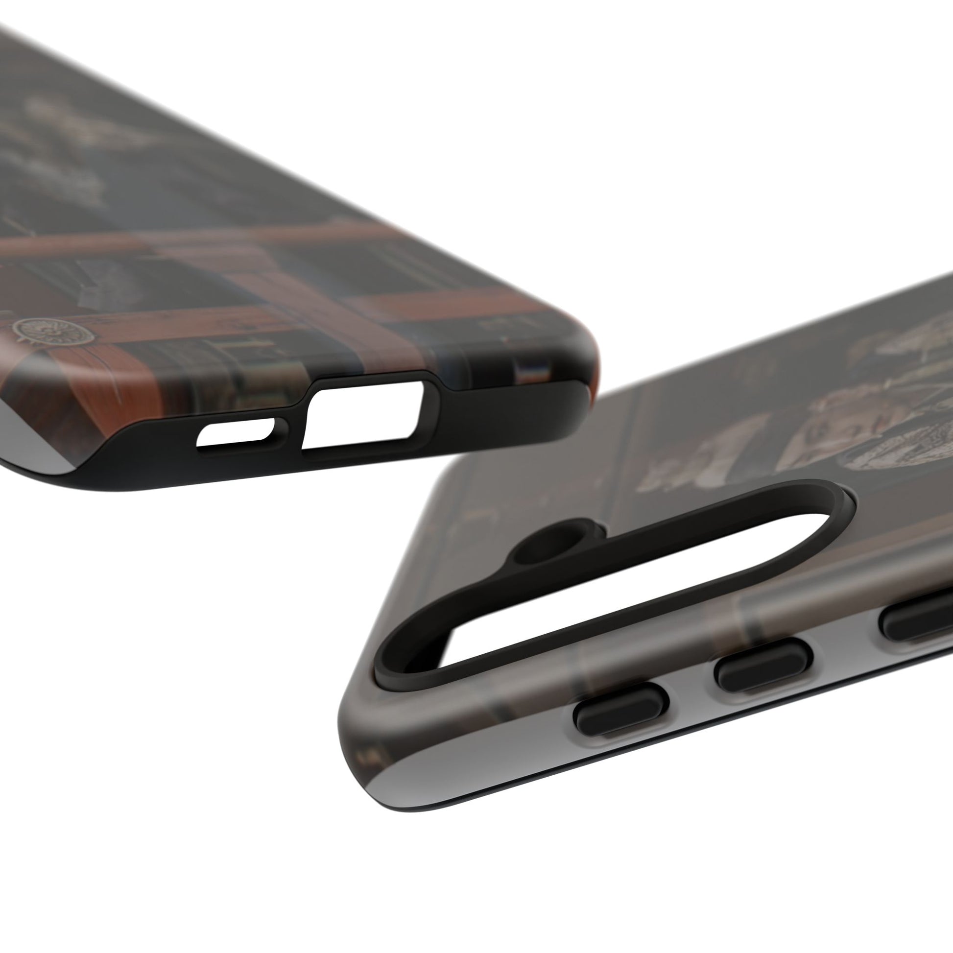 A rugged protective phone case printed with a moody, cinematic image—muted browns and deep shadows frame a figure in traditional dress looking out from a wooden balcony. The dual-layer shell combines a glossy or matte printed polycarbonate exterior with a soft TPU silicone liner for shock absorption. It wears in with character rather than shouting; the print’s subdued palette blends with everyday carry while still signaling refined, vintage-inspired taste. Built to resist outdoor fading and certified to safety standards, this case keeps your phone secure and looking quietly artful during daily commutes, weekend markets, or on-set fan meetups.
