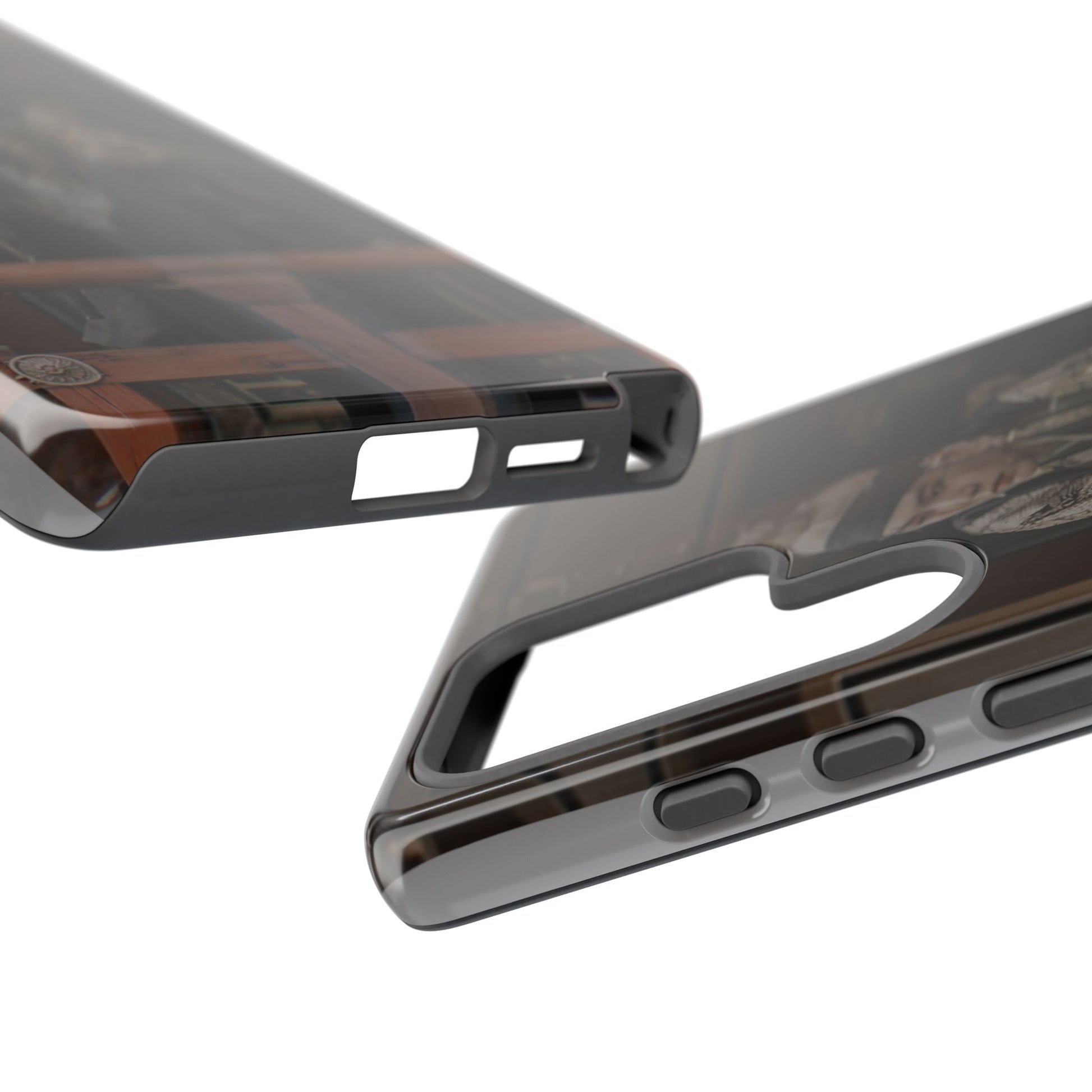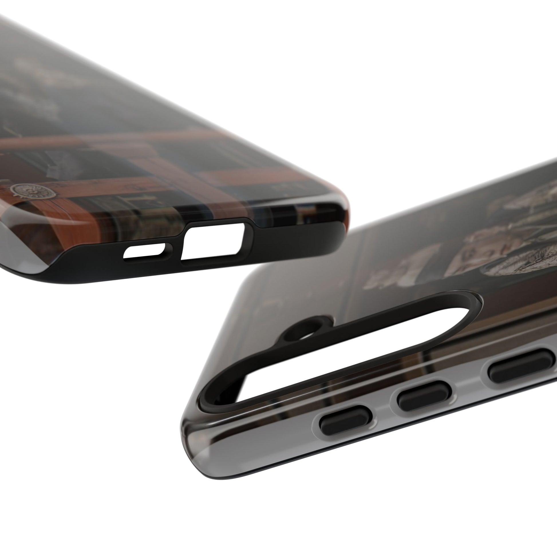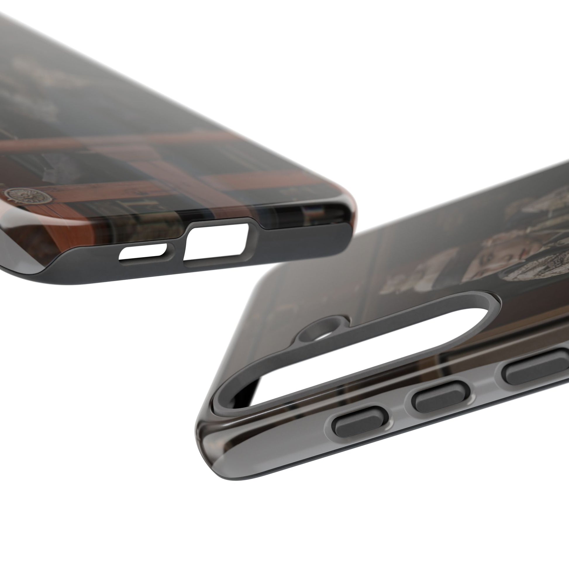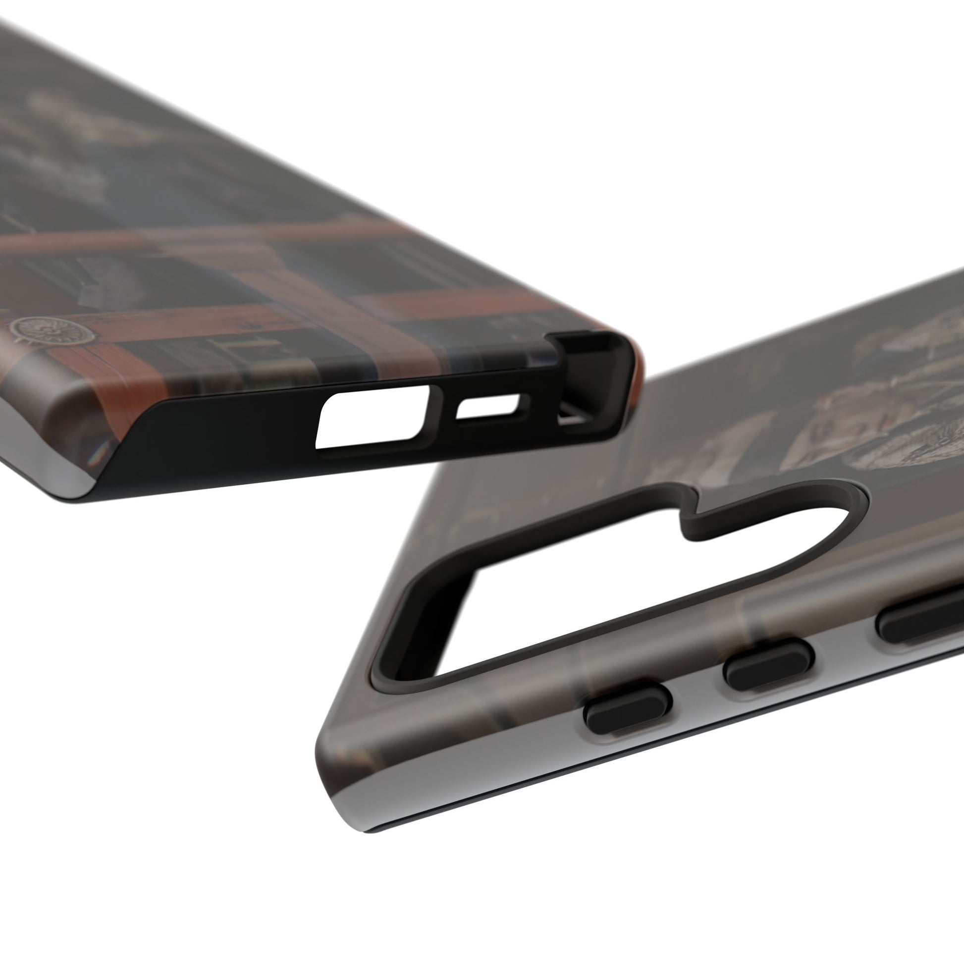 A rugged protective phone case printed with a moody, cinematic image—muted browns and deep shadows frame a figure in traditional dress looking out from a wooden balcony. The dual-layer shell combines a glossy or matte printed polycarbonate exterior with a soft TPU silicone liner for shock absorption. It wears in with character rather than shouting; the print’s subdued palette blends with everyday carry while still signaling refined, vintage-inspired taste. Built to resist outdoor fading and certified to safety standards, this case keeps your phone secure and looking quietly artful during daily commutes, weekend markets, or on-set fan meetups.