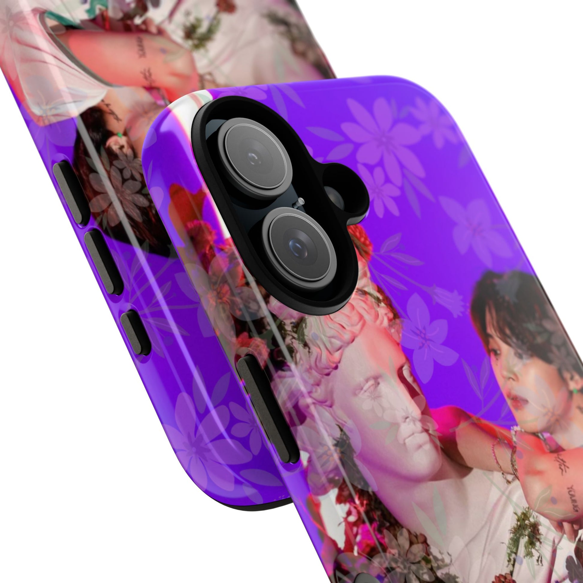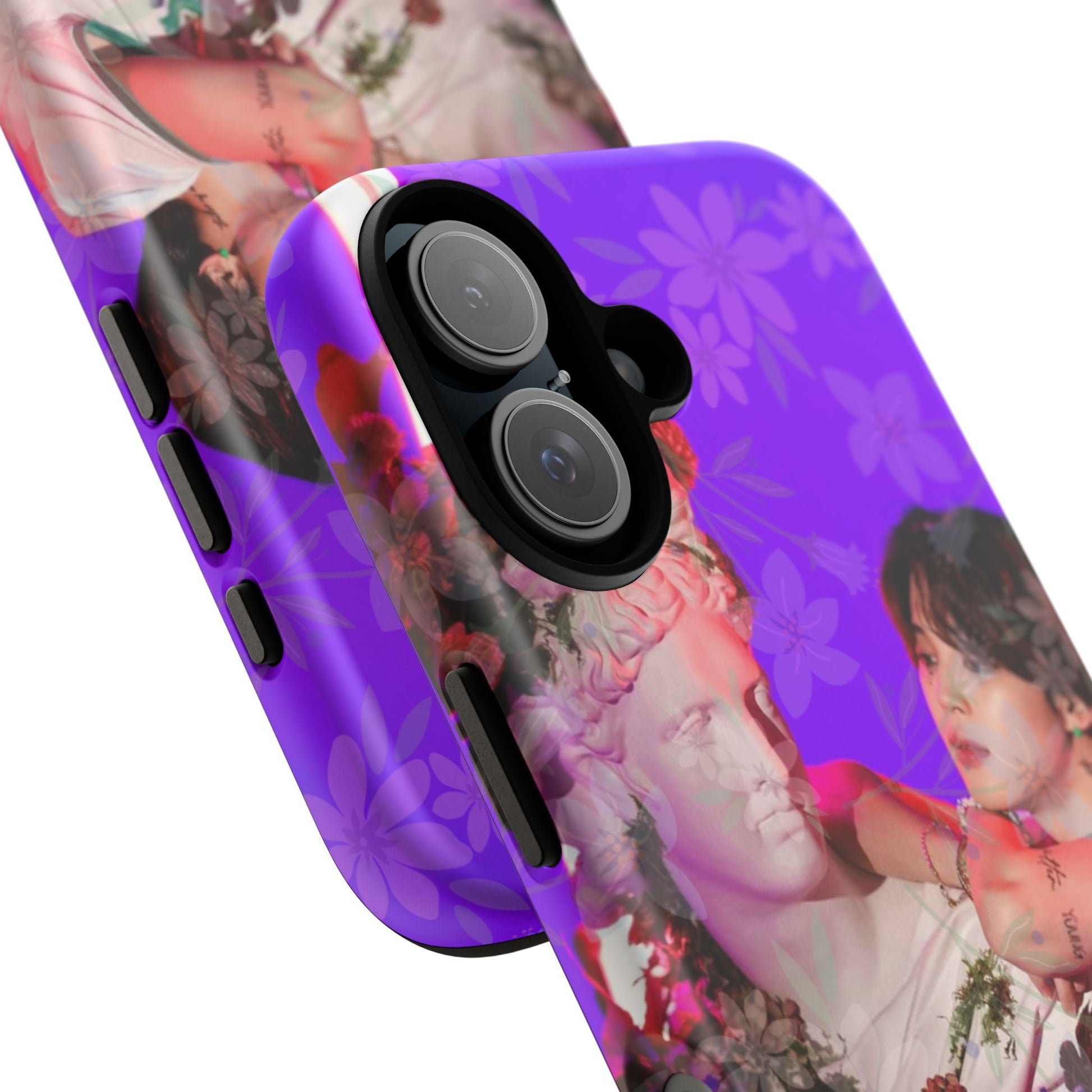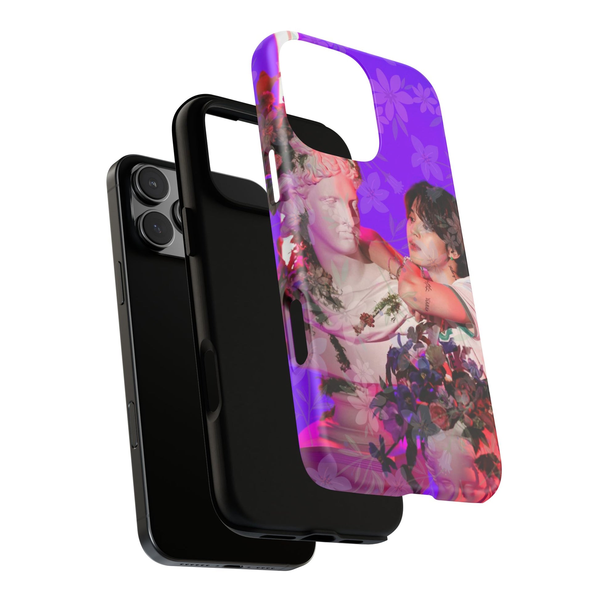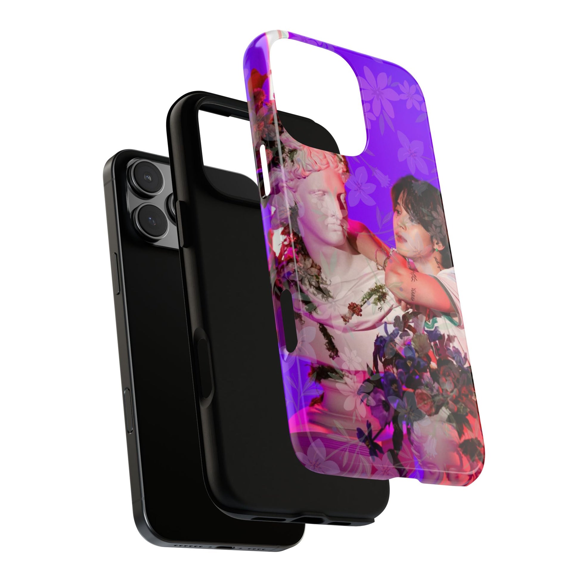 A vivid, art-driven protective phone case that turns your device into a small gallery. Rich magenta and violet tones frame a classical statue entwined with lush flowers and a contemplative figure — an image that feels both nostalgic and modern. The dual-layer shell hugs the phone while a soft TPU liner absorbs shocks; the high-density 3D wrap keeps colors saturated and resistant to outdoor fading. Lightweight, glossy or matte finish options keep the print punchy and tactile. For those who treat their tech like wearable art, this case brings a striking visual story to everyday use.