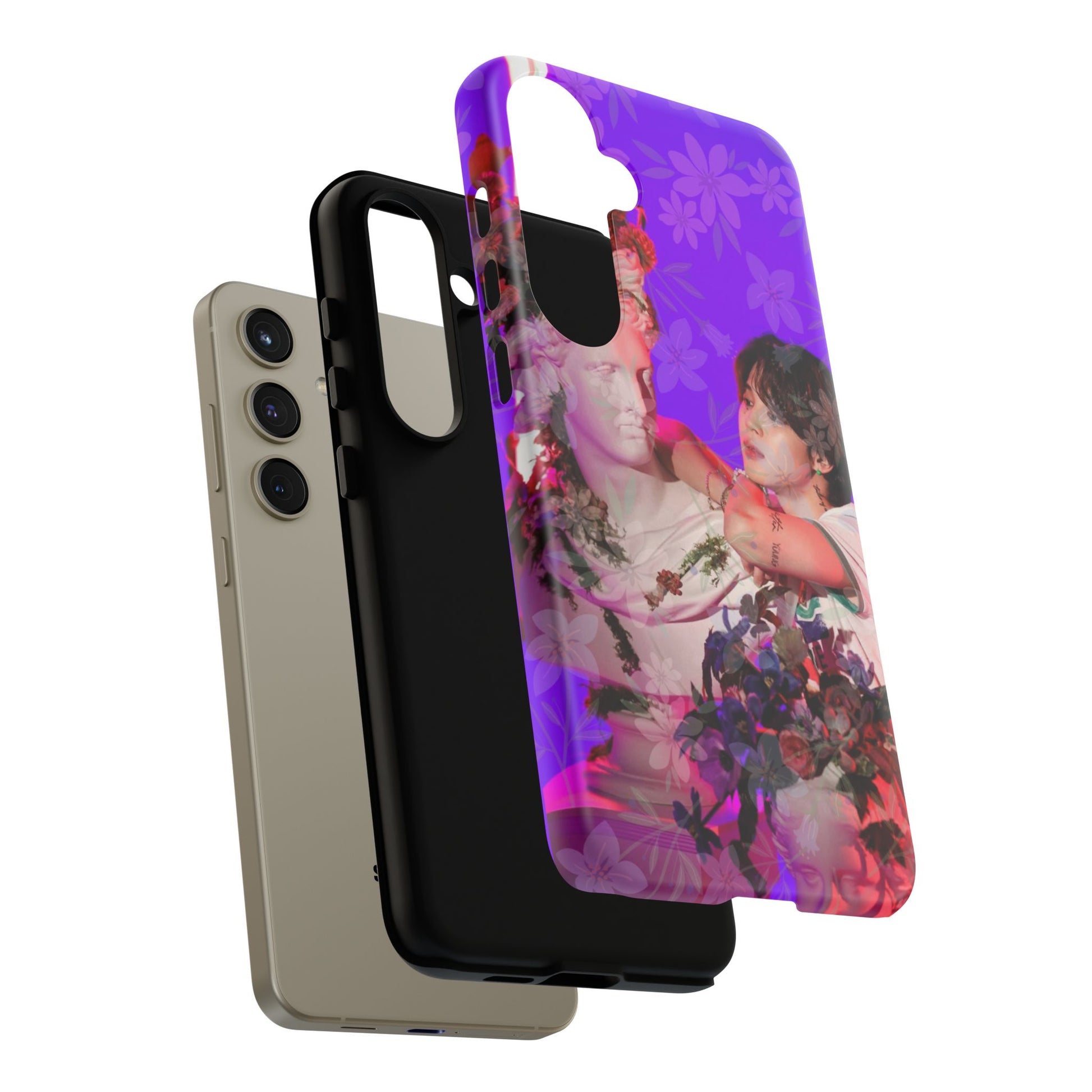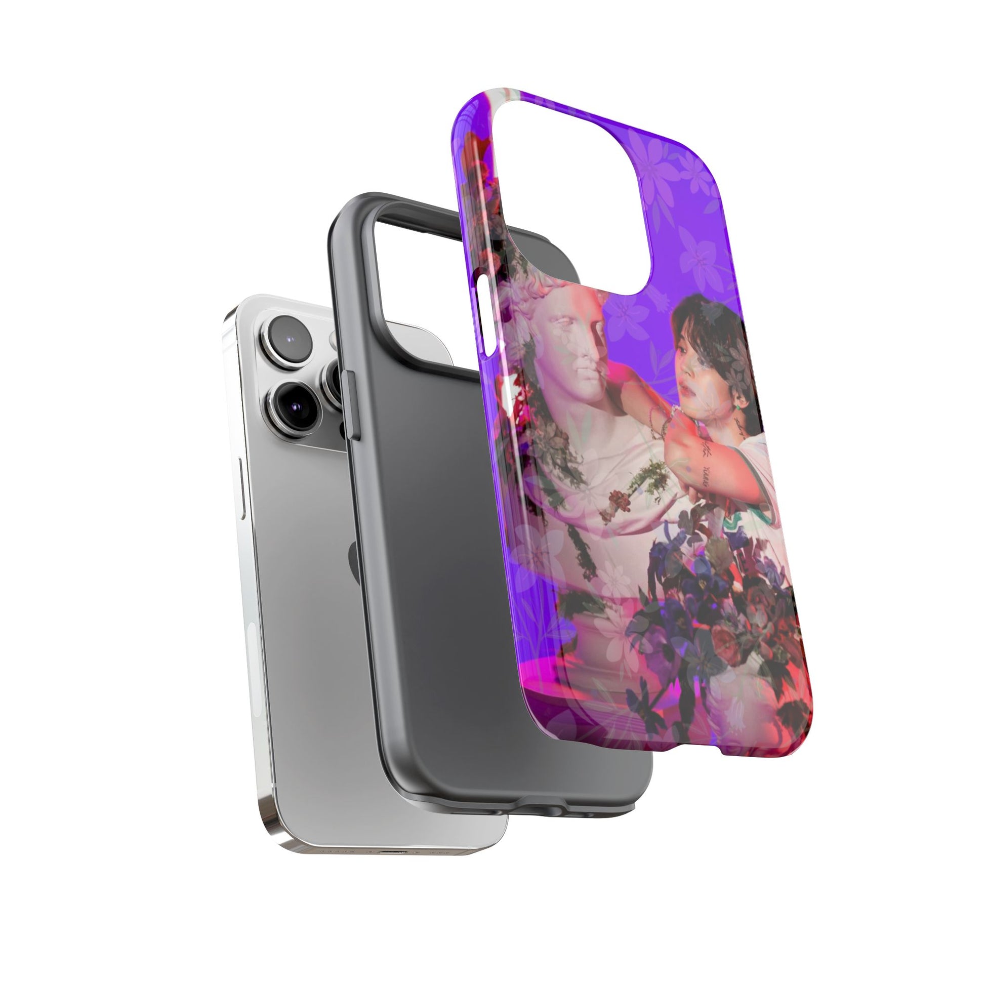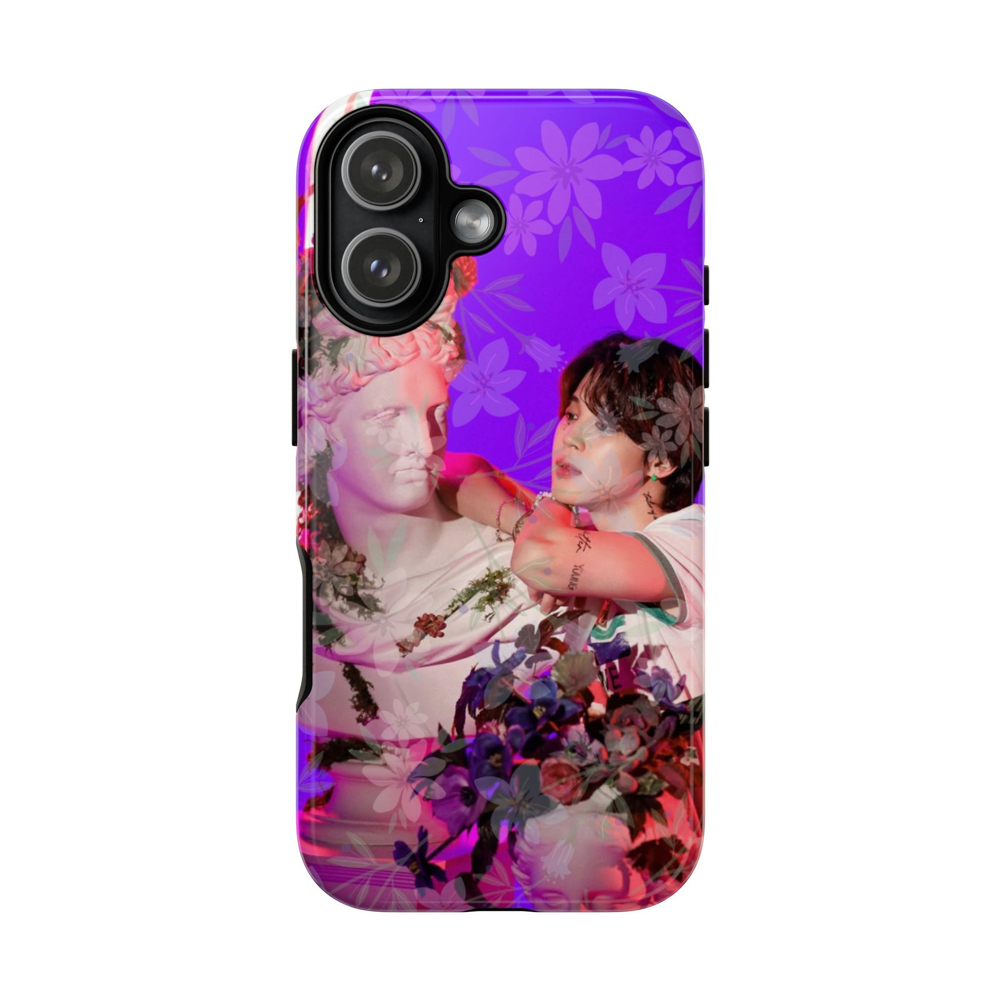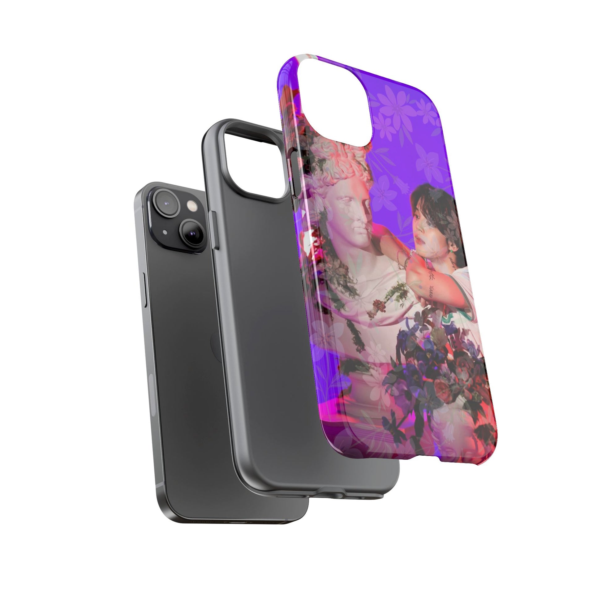 A vivid, art-driven protective phone case that turns your device into a small gallery. Rich magenta and violet tones frame a classical statue entwined with lush flowers and a contemplative figure — an image that feels both nostalgic and modern. The dual-layer shell hugs the phone while a soft TPU liner absorbs shocks; the high-density 3D wrap keeps colors saturated and resistant to outdoor fading. Lightweight, glossy or matte finish options keep the print punchy and tactile. For those who treat their tech like wearable art, this case brings a striking visual story to everyday use.