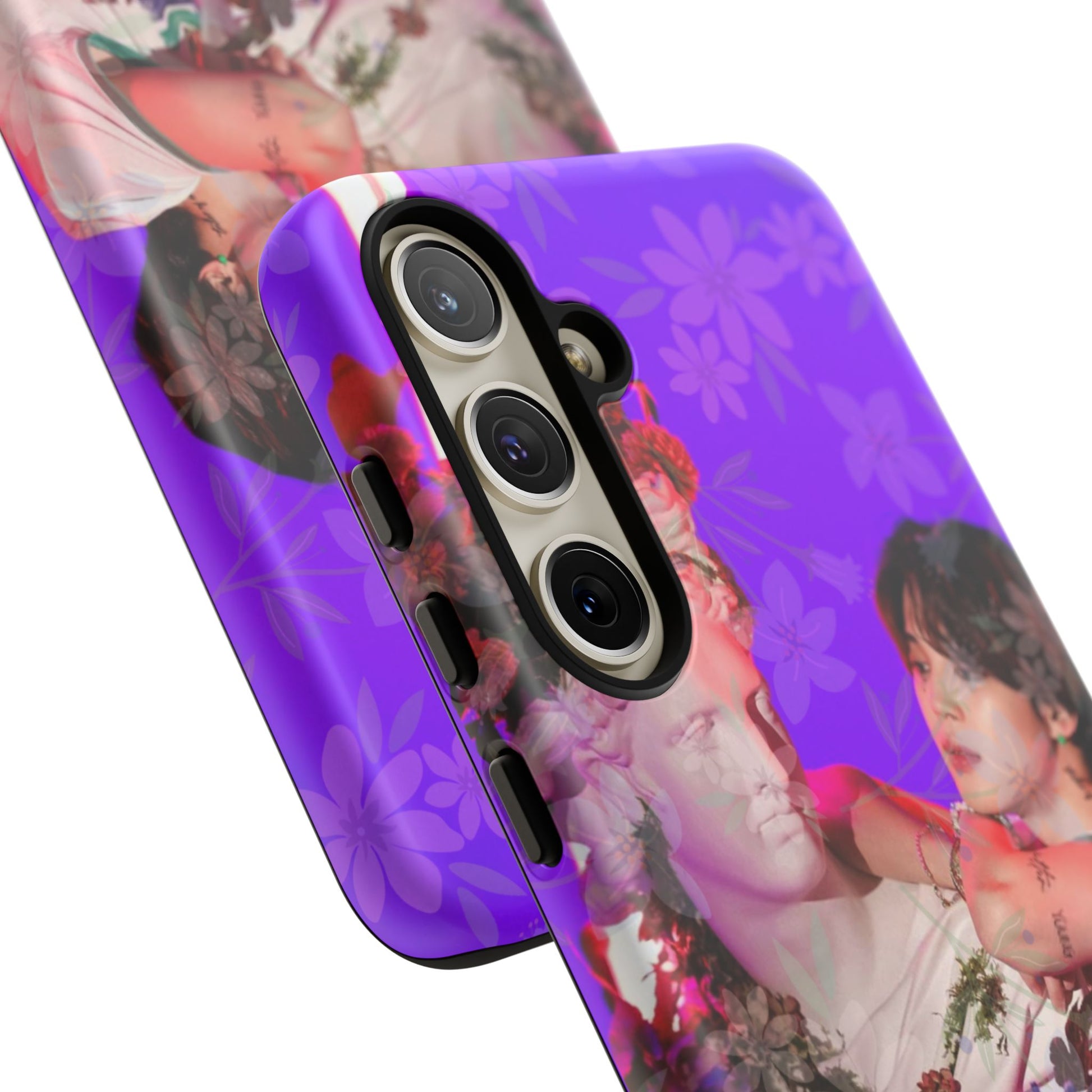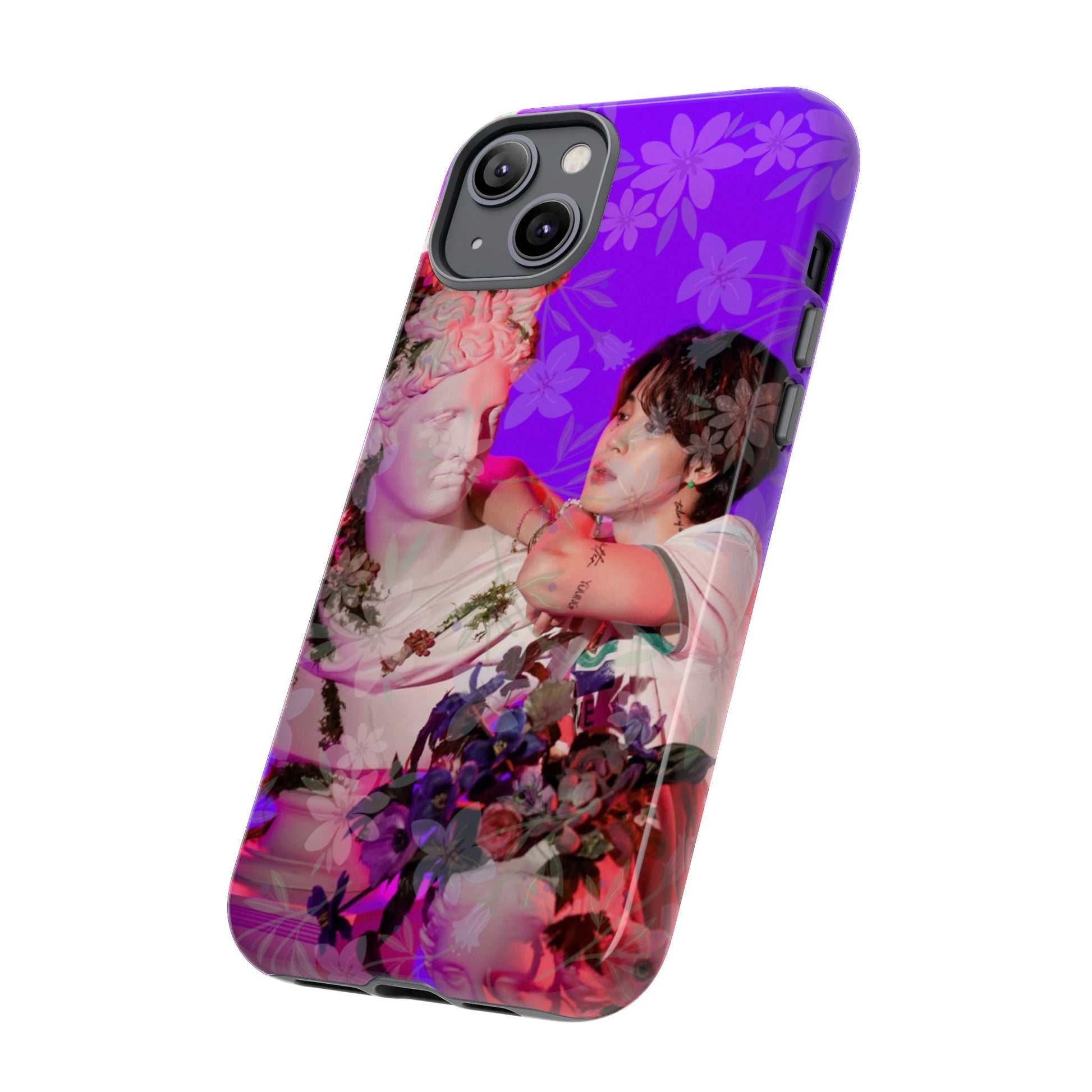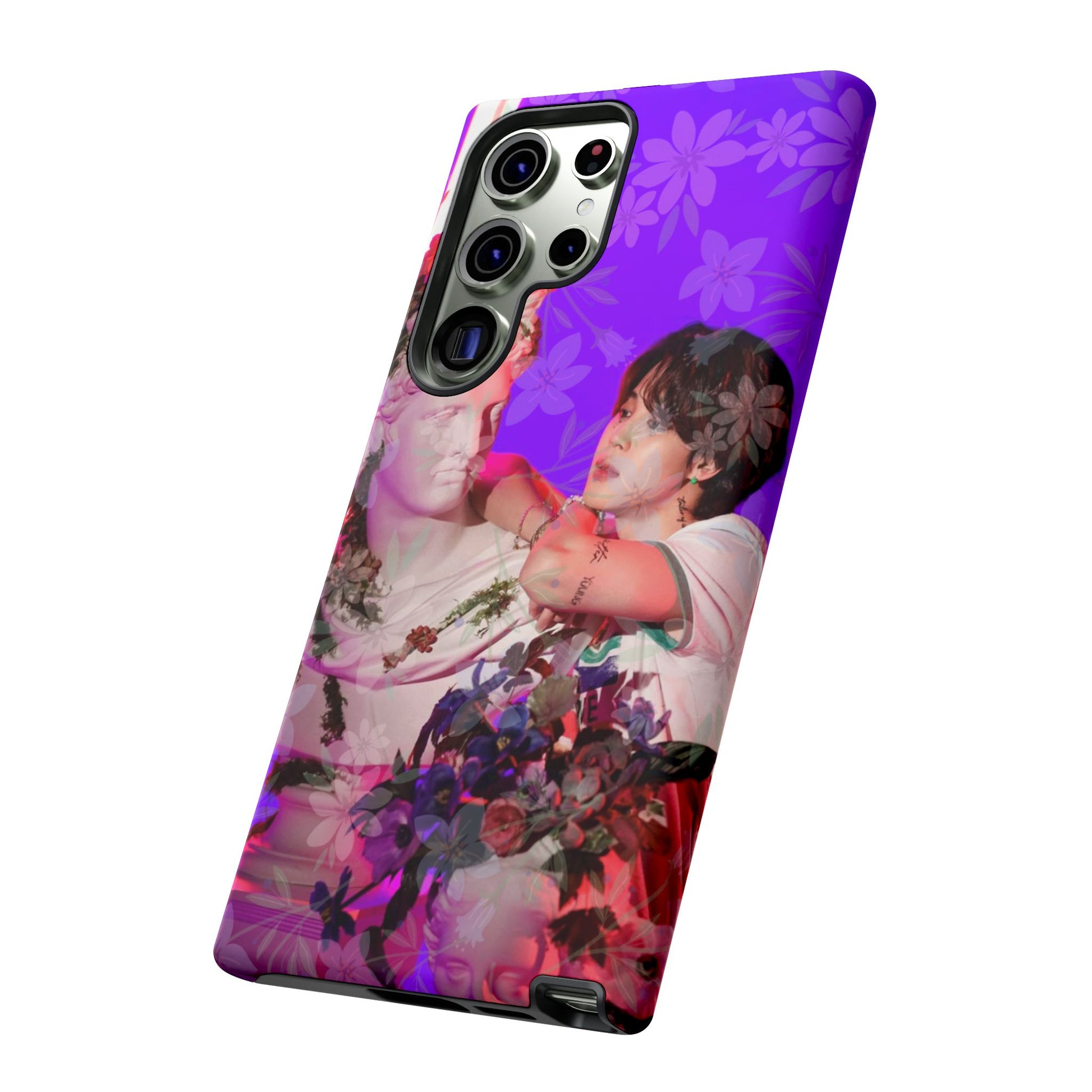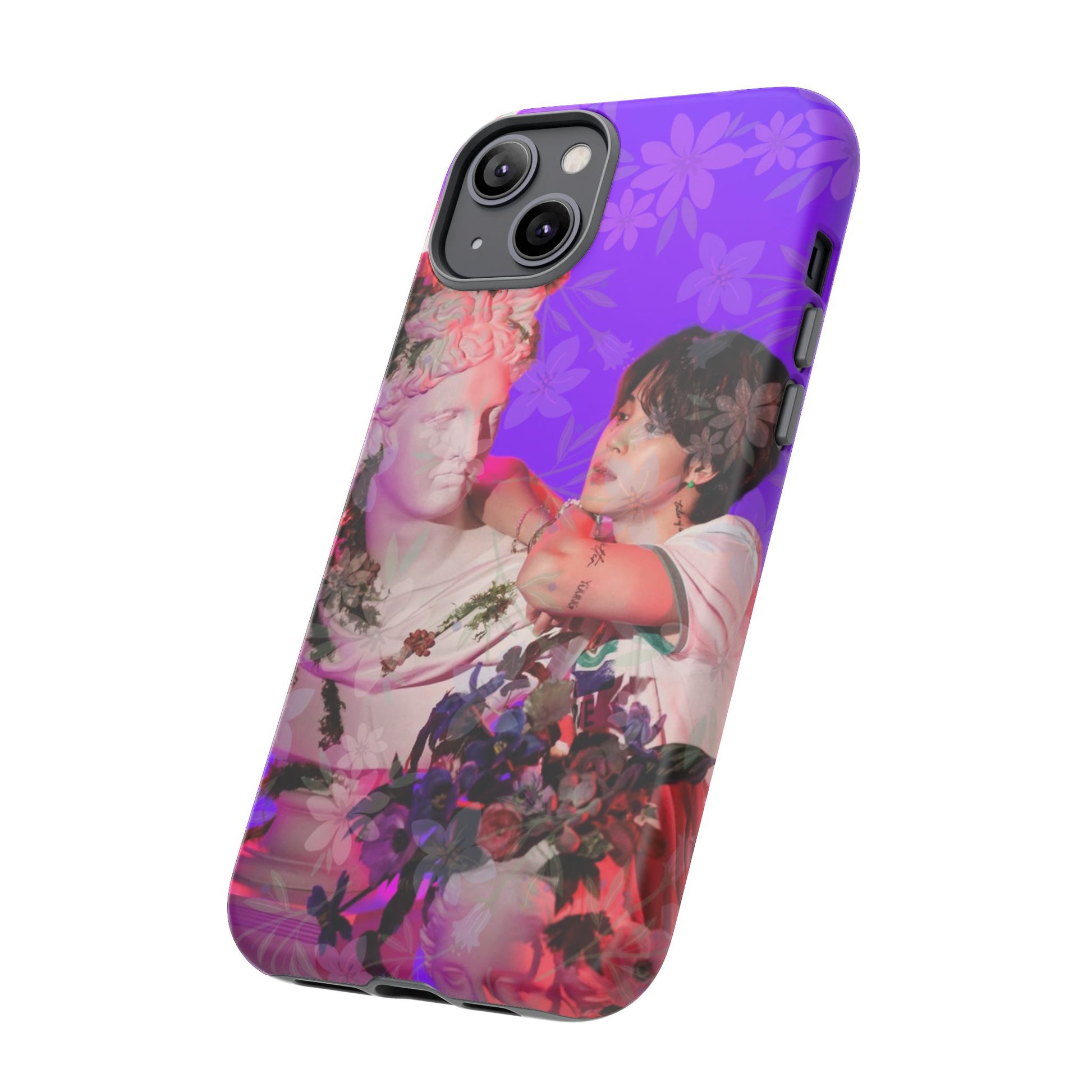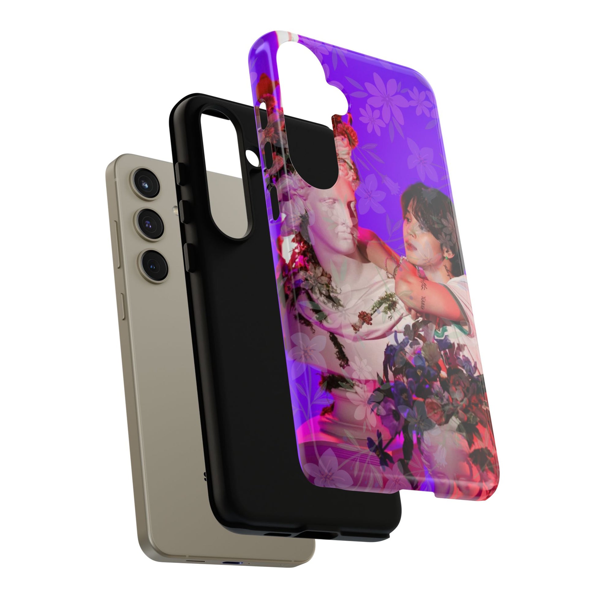 A vivid, art-driven protective phone case that turns your device into a small gallery. Rich magenta and violet tones frame a classical statue entwined with lush flowers and a contemplative figure — an image that feels both nostalgic and modern. The dual-layer shell hugs the phone while a soft TPU liner absorbs shocks; the high-density 3D wrap keeps colors saturated and resistant to outdoor fading. Lightweight, glossy or matte finish options keep the print punchy and tactile. For those who treat their tech like wearable art, this case brings a striking visual story to everyday use.